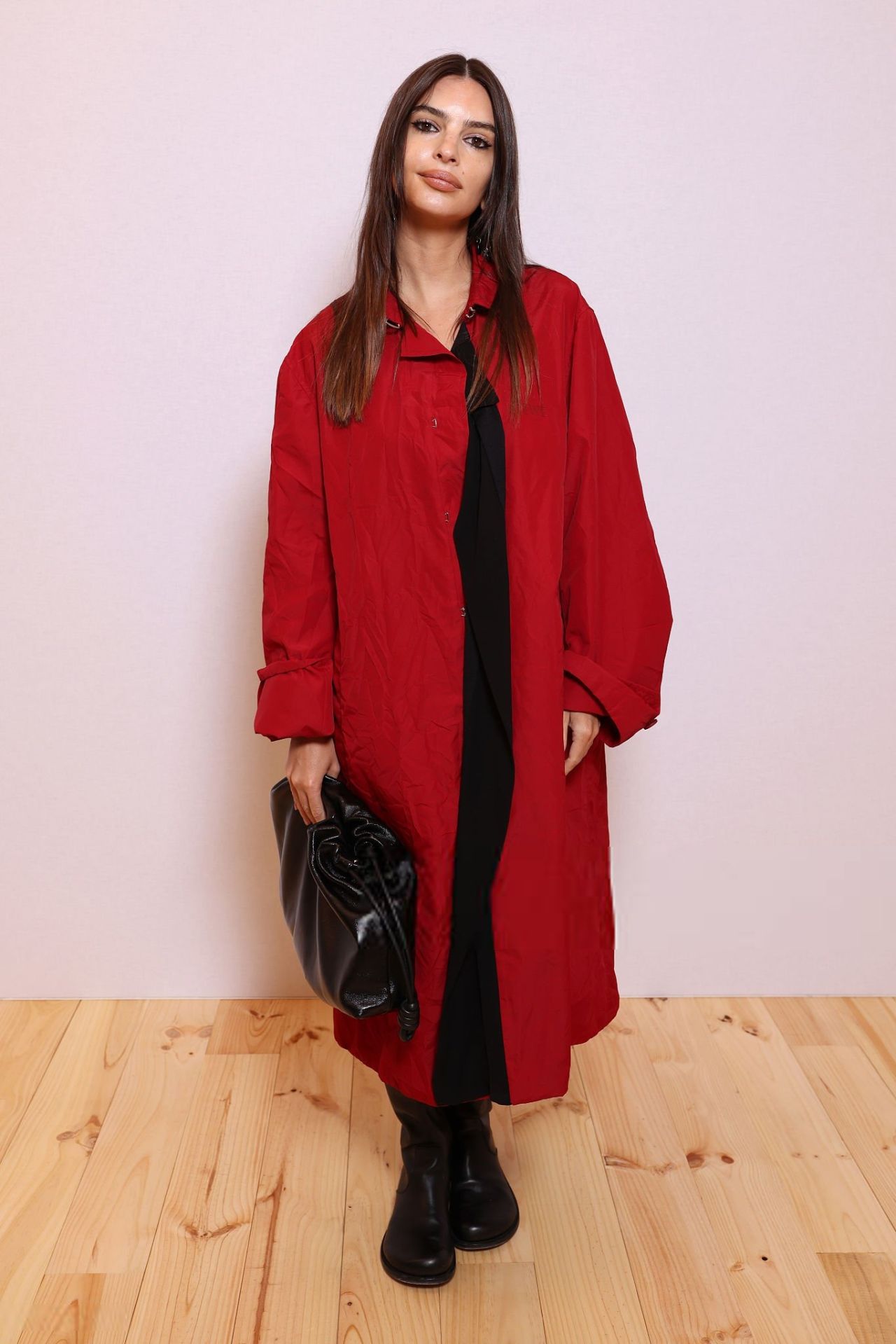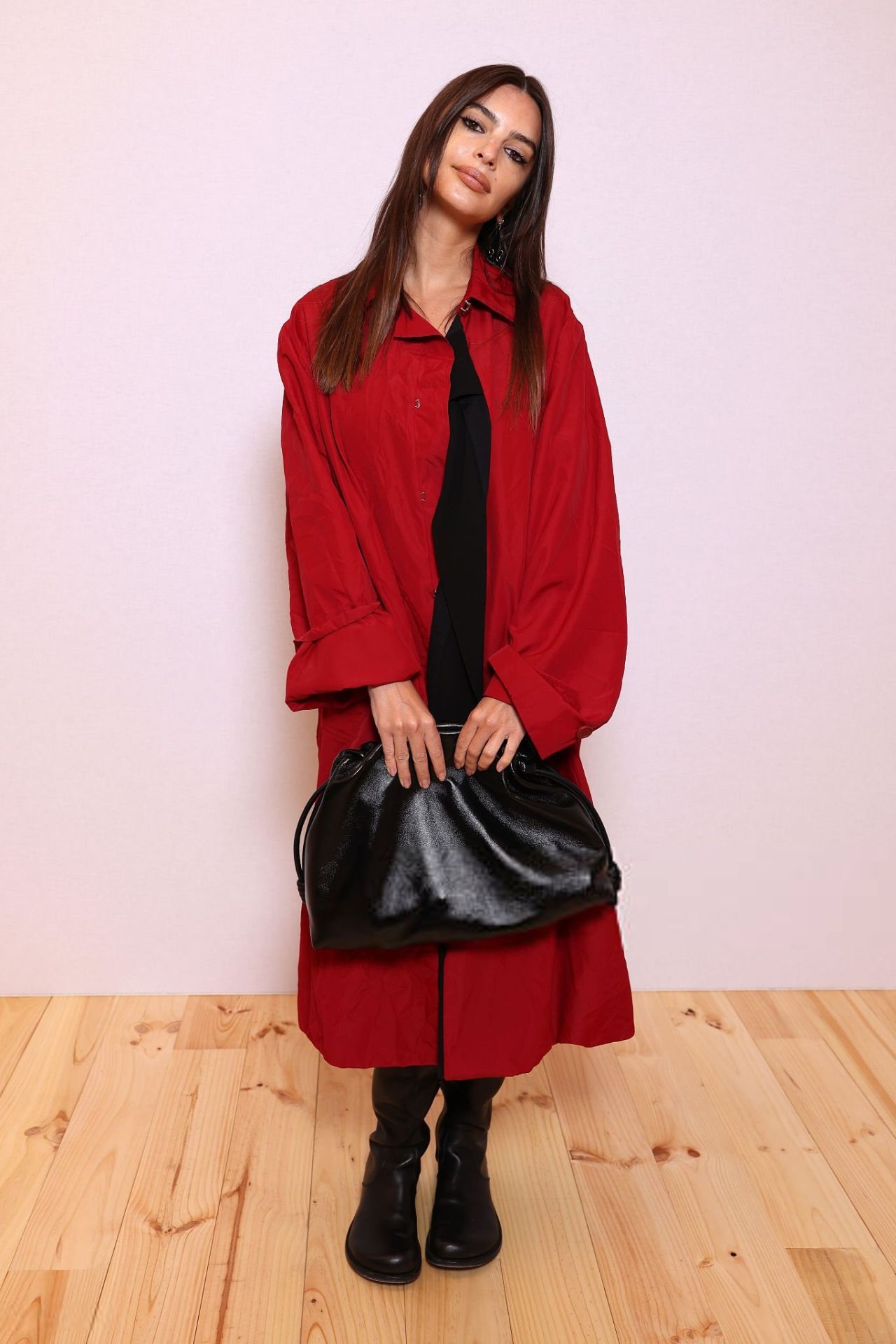 This ensemble aligns perfectly with the recent direction of Loewe under creative director Jonathan Anderson. His work often explores the idea of volume and negative space, turning familiar shapes into conceptual statements—making a simple shirt or coat feel architectural through exaggeration. Ratajkowski’s choice of an oversized piece that nearly engulfs the body, paired with an iconic bag like the Flamenco Purse, demonstrates a high-fashion literacy that respects the brand’s intellectual, yet playful, approach to luxury and tailoring.