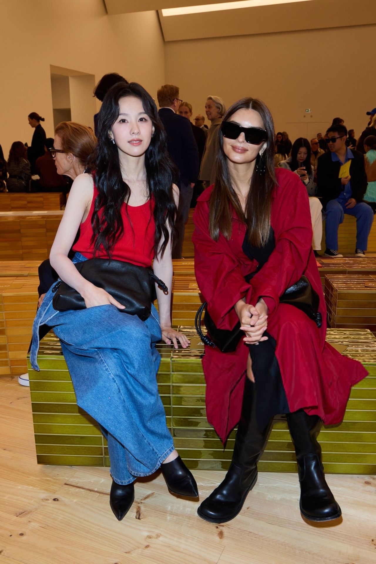 Emily Ratajkowski Embraces Exaggerated Proportions and Graphic Color Blocking for the Loewe Show During Paris Fashion Week in October 2025.